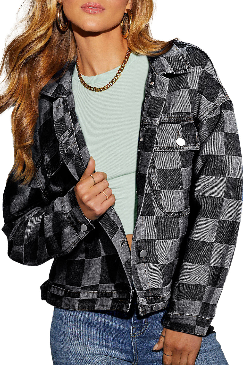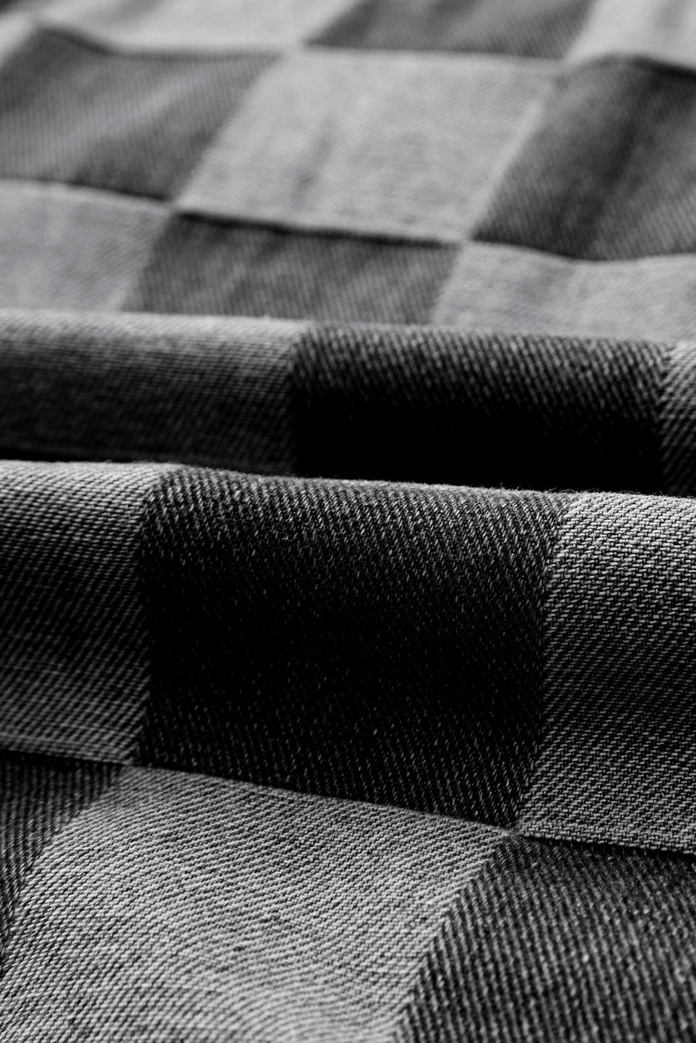 • The checkered patchwork design adds a trendy flair to the classic button-up style, creating a unique and eye-catching look.