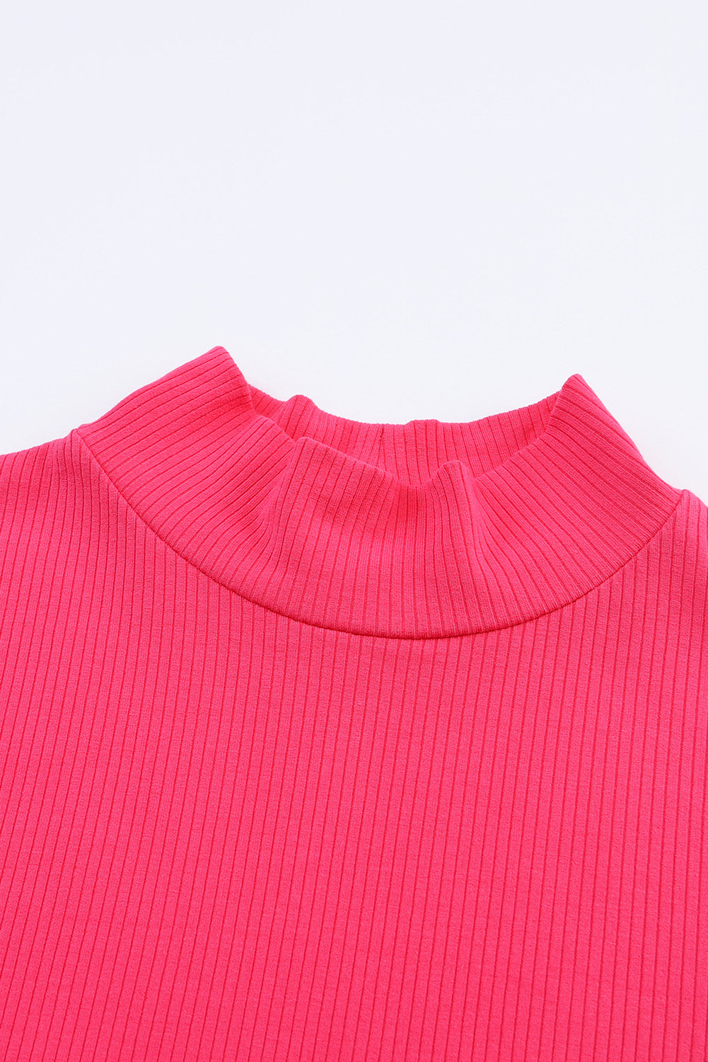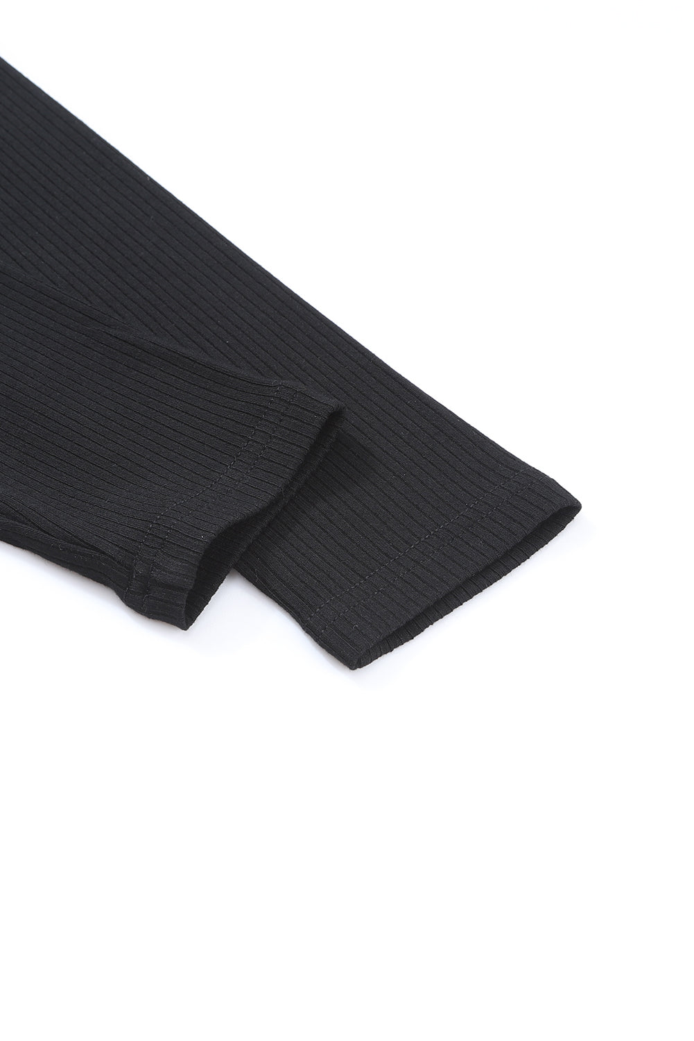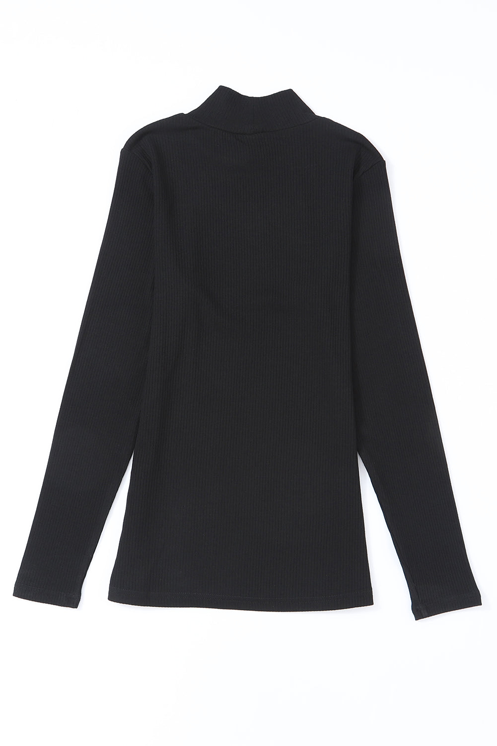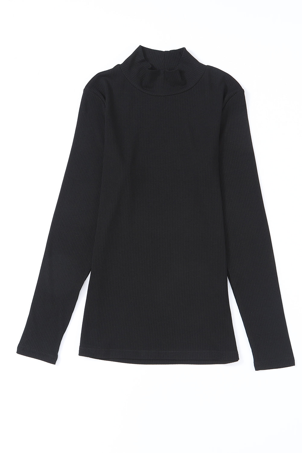 Black Plain Solid Color Ribbed Long Sleeve Mock Neck Top