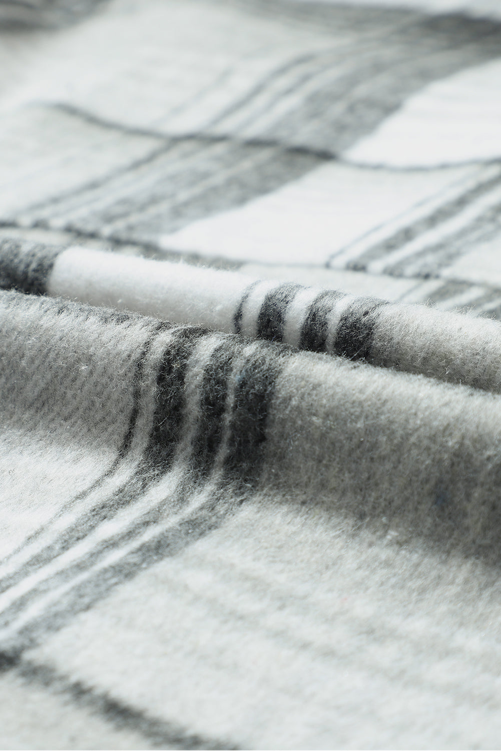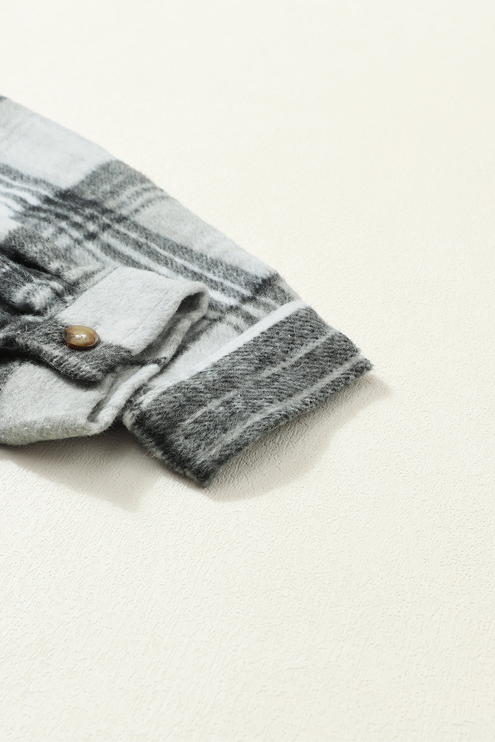 • An allover plaid print, front chest pockets, and tortoise buttons create a chic style