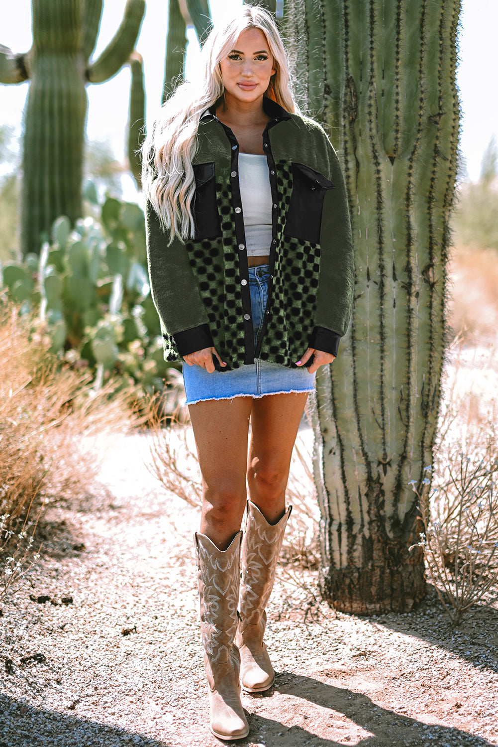 Vineyard Green Fleece Checkerboard Flap Pocket Snap Button Jacket
