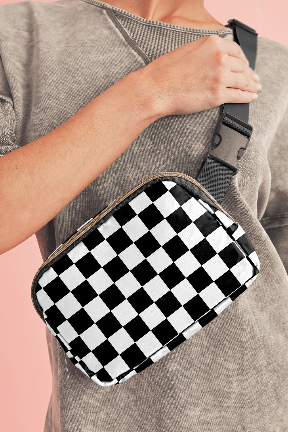 White Checkered Print Buckle Wide Belt Crossbody Bag